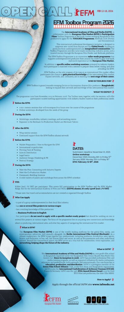 The International Academy of Film and Media (IAFM), in collaboration with the European Film Market (EFM) and Participation Films Toolbox Programme of Berlinale, invites emerging Bangladeshi film producers to apply for the TOOLBOX Programme, Berlinale 2026 (Fiction and Documentary).